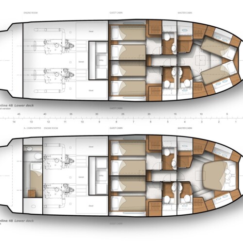 Raspored se sastoji od tri kabine, dvije gostinjske kabine sa svake strane i vlasničkom kabinom na pramcu. U vlasničkoj kabini posebno se ističu prostranost, svjetlost i veliki prozori koji omogućuju dobar pogled, kao i udubljeni bočni bokovi izvana koji omogućuju izravan pogled prema van.
