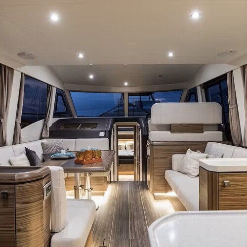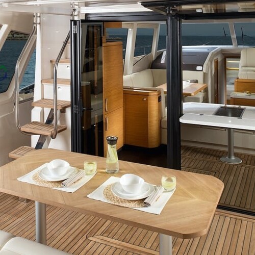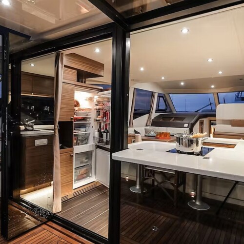 Greenline 48 Fly ima kuhinju smještenu na krmi i veliki prozor koji se podiže kako bi povezao unu-tarnji i vanjski prostor. Tu je i barski pult koji se može produžiti kako bi posluživao hranu ili piće u kokpitu. Pozornost privlače i sjedeći prostor jahte te veliki prozori koji pružaju izvrstan pogled pre-ma van.
