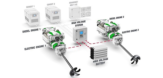 Motori s unutarnjim izgaranjem su sukladni Stage V i mogu se spojiti s elektromotorima nazivne snage od 184 i 368 kilovata. E-motor se može u potpunosti odvojiti od diesel motora elektromagnetskom spojkom, a može se koristiti i kao pogonski motor i kao generator za proizvodnju električne energije. Baterije u sustavu mogu se puniti iz kopnene veze, proizvodnje na brodu, glavnog motora ili solarnih ćelija, a mogu imati energetski kapacitet do 250 kWh.