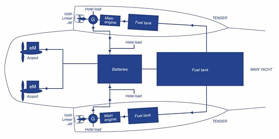 Mogućnost transformacije tijekom plovidbe daje novu razinu superjahte s dvostrukim odvojivim pomoćnim čamcima (tenderima) koji daju pogon matičnom brodu. Jahta čak ima odjeljivu kućicu za plažu i bazen s kompenzacijom gibanja.