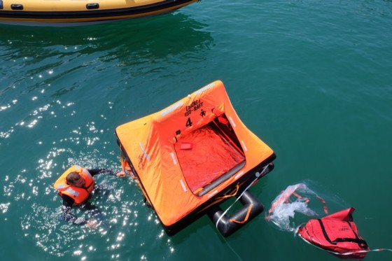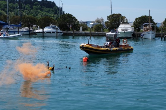 Pokazne vježbe održale su se na morskoj površini unutar sajma a uključivale su ispaljivanje signalne rakete i aktiviranje dimnog signala, prezentaciju korištenja klasičnoga, krutog pojasa za spašavanje kao i praktičnog samonapuhujućeg pojasa koje su nosila dvojica "unesrećenih", ali i aktiviranje splavi za spašavanje te njihovo izvlačenje iz mora na spasilačko plovilo.