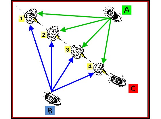 Plovila A, B i C odvojena su nekoliko milja, s munjom u blizini. Na poziciji (munje) 1, svako plovilo odredilo je položaj munje na horizontu. Na poziciji 2, Plovilo A zapaža da munja ide na lijevo, što indicira njenu putanju po lijevoj strani. Plovilo B zapaža da munja ide na desno, što indicira njenu putanju po desnoj strani. Plovila A i B nastavljaju pratiti smjer kretanja munja i izračunavaju njihovu udaljenost sve dok oluja ne prođe (pozicija 4 na ilustraciji).