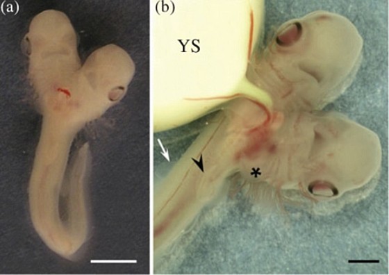 Embrij je imao dvije glave, a svaka glava imala je zasebna usta, oči, mozak i škržne otvore. Jedno tijelo imalo je dvostruki želudac i dvostruku jetru. Takva razvojna anomalija naziva se dicefalija. Rijetka je u životinjskom svijetu, ali zabilježena je kod drugih vrsta morskih pasa, zmija, dupina i ljudi. Pojava dicefalije može biti posljedica genetske predispozicije, virusnih infekcija i okolišnih čimbenika. U ovom slučaju svih 797 embrija razvijalo se u istim okolišnim uvjetima i nije zabilježena prisutnost nekih mutagenih spojeva. Utvrđeno je da je samo jedan embrij imao spomenutu razvojnu anomaliju. Iz navedenoga znanstvenici su zaključili da uzrok ovoj pojavi nisu okolišni čimbenici, već da uzrok treba tražiti u genetskim faktorima.