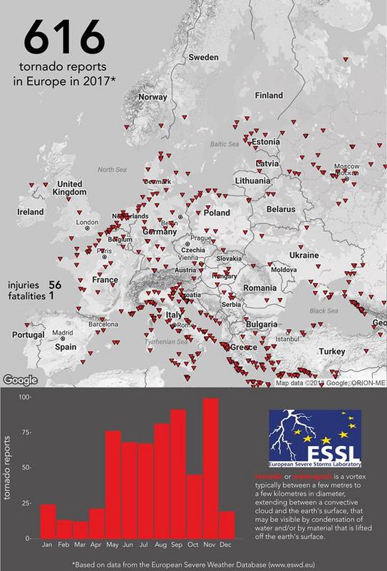 Europski laboratorij za opasne oluje (European Severe Storms Laboratory – ESSL) je na svojoj Facebook stranici objavio podatke o opasnim vremenskim nepogodama u Europi za 2017. godini