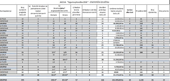 Pojačani nadzor sigurnosti plovidbe u okviru akcije „Sigurna plovidba 2018“ provelo je 81 službenika iz osam lučkih kapetanija i pripadajućih 72 ispostave, sa 25 službenih plovila, kojima su preplovili 1228 nautičkih milja u koordinaciji sa Službom za nadzor i upravljanje pomorskim prometom (VTS), odakle je tijekom trajanja akcije osigurana podrška dojavama o uočenim područjima pojačanog prometa plovila, prekršajima u plovidbi, (ne)identificiranim pomorskim objektima, a naročito u slučajevima glisiranja preblizu obale, odnosno, u područjima pojačane gustoće pomorskoga prometa.