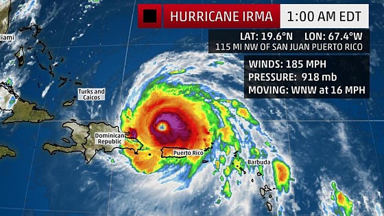 Irmini maksimalni vjetrovi pušu stabilnom brzinom od 185 mph (oko 300 km/h) bazirano na podacima NOAA-e i Air Force Hurricane Huntera (lovca uragana) zapanjujućih 34 sata (vidi video).
